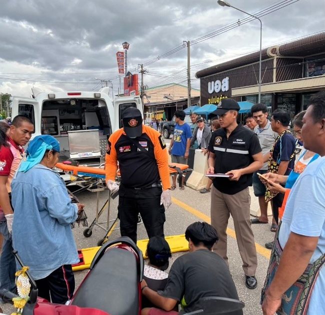 งานสอบสวน – ร.ต.ท.วรเชษฐ กันหาเรือง พนักงานสอบสวน ตรวจสถานที่เกิดเหตุรถมอเตอร์ไซเฉี่ยวชนกันในบริเวณตลาดปางมะค่า